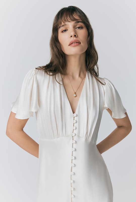 - Designed in stunning satin, Meryl, our ivory white satin midi dress is a pretty button-down style that features pleated shoulders, long sleeves, seaming at the waist for a glamorous silhouette and a wrap tie-waist to complete the elegant look. The bias-cut skirt makes for a flattering fit, while the front split adds a touch of femininity. Wear yours with stylish heels for a cocktail party or dinner date – plus it would also make the perfect bridesmaid's dress.